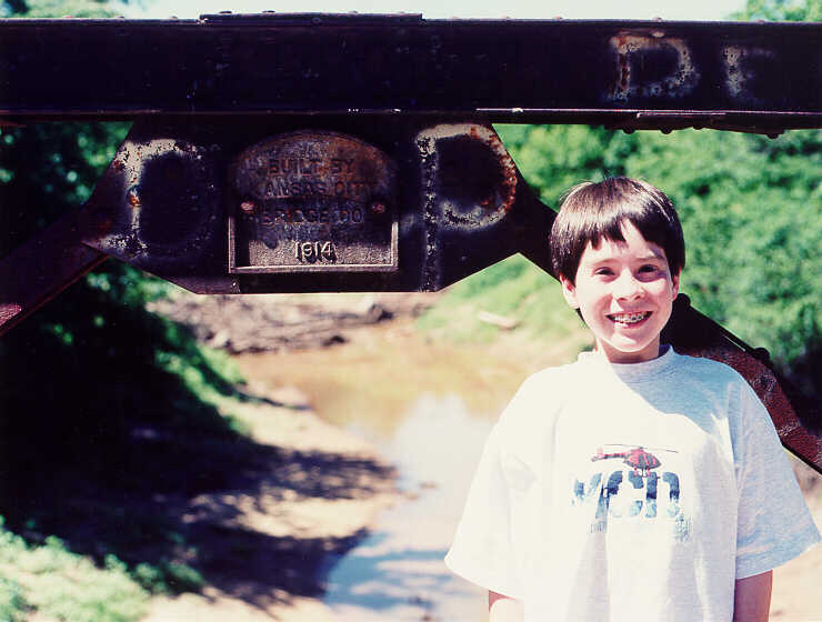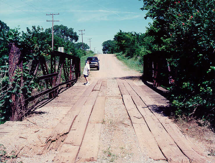 Oh look! Dad has the camera, <CLOWN MODE> let's explore to what extent we can torture Dad and remove any pretense of civility. Oops he's putting away </CLOWN MODE> his camera now ...The steel truss bridge over Little Deep Fork Creek dates to 1914, as you can see on the surviving metal plate. We found this bridge thanks to Jim Ross and his article in the Spring 1997 issue of the Federation News, published by the National Historic Route 66 Federation. 66:51