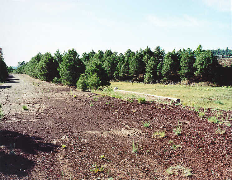 On the left, near Parks, several alignments of Route 66 converge and branch. Extending down from Fortynine Hill are the 1921 and 1931 alignments, which separate at the blue dot. The 1931 alignment (yellow dot) extends for about a mile, then rejoins the others. The 0.5 mile 1921 alignment (second blue dot) is just barely visible. The photograph back on the AZ.HTM page shows it as a grassy cut through the trees. It approaches the 1941 alignment (red dot), and then extends northwestward to cross with the 1931 alignment near Parks AZ. The 1941 alignment eastbound is terminated by the interstate at the other red dot. Here is a photo of that section, looking southwest towards the Interstate. There is an Interstate sign on the extreme left, and the guard rail on the extreme right of the photo. Between Bellemont and Parks, several short segments of the 1941 alignment (red lines) can be glimpsed just south of the interstate. Back to AZ, or 66:51